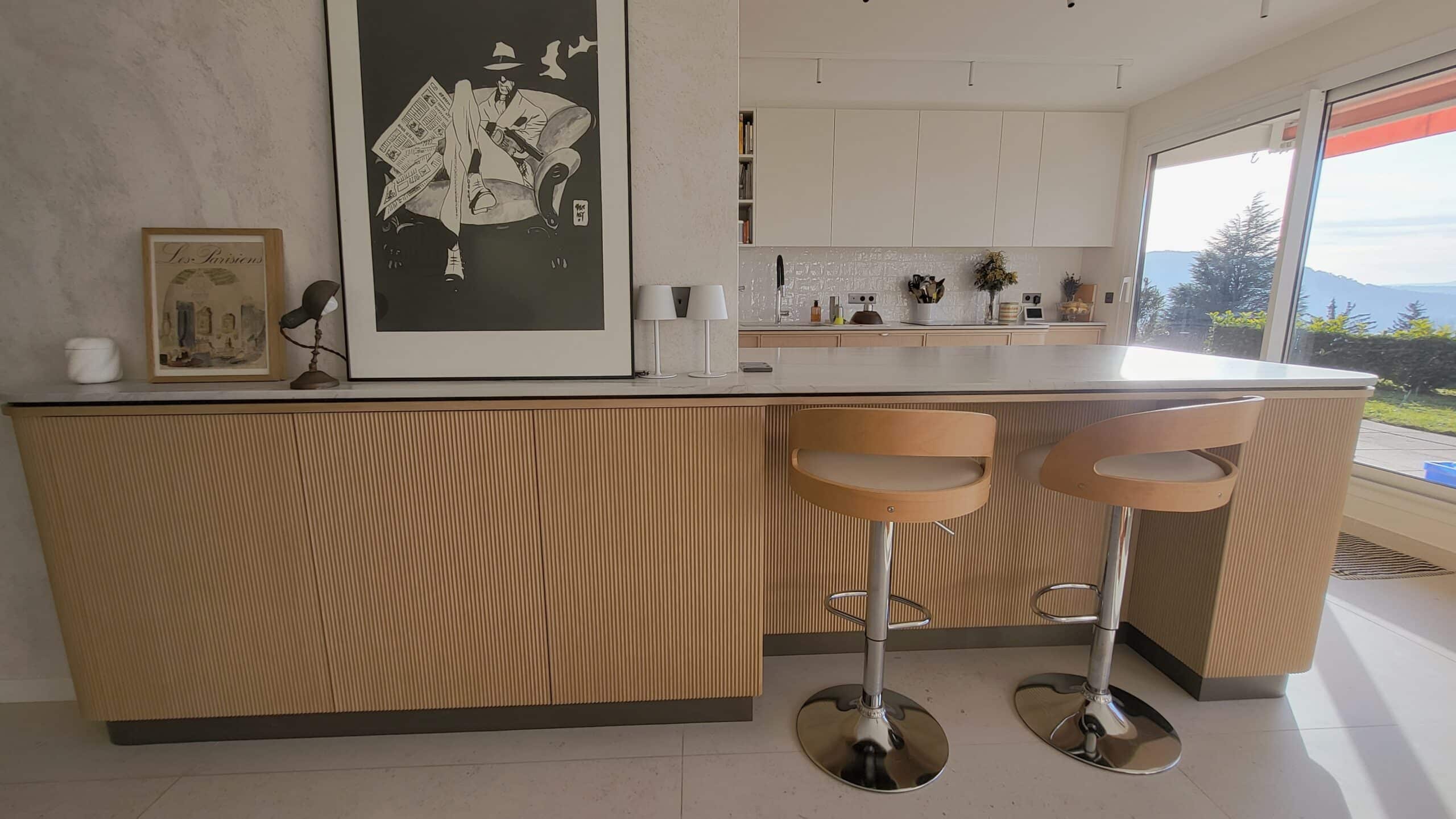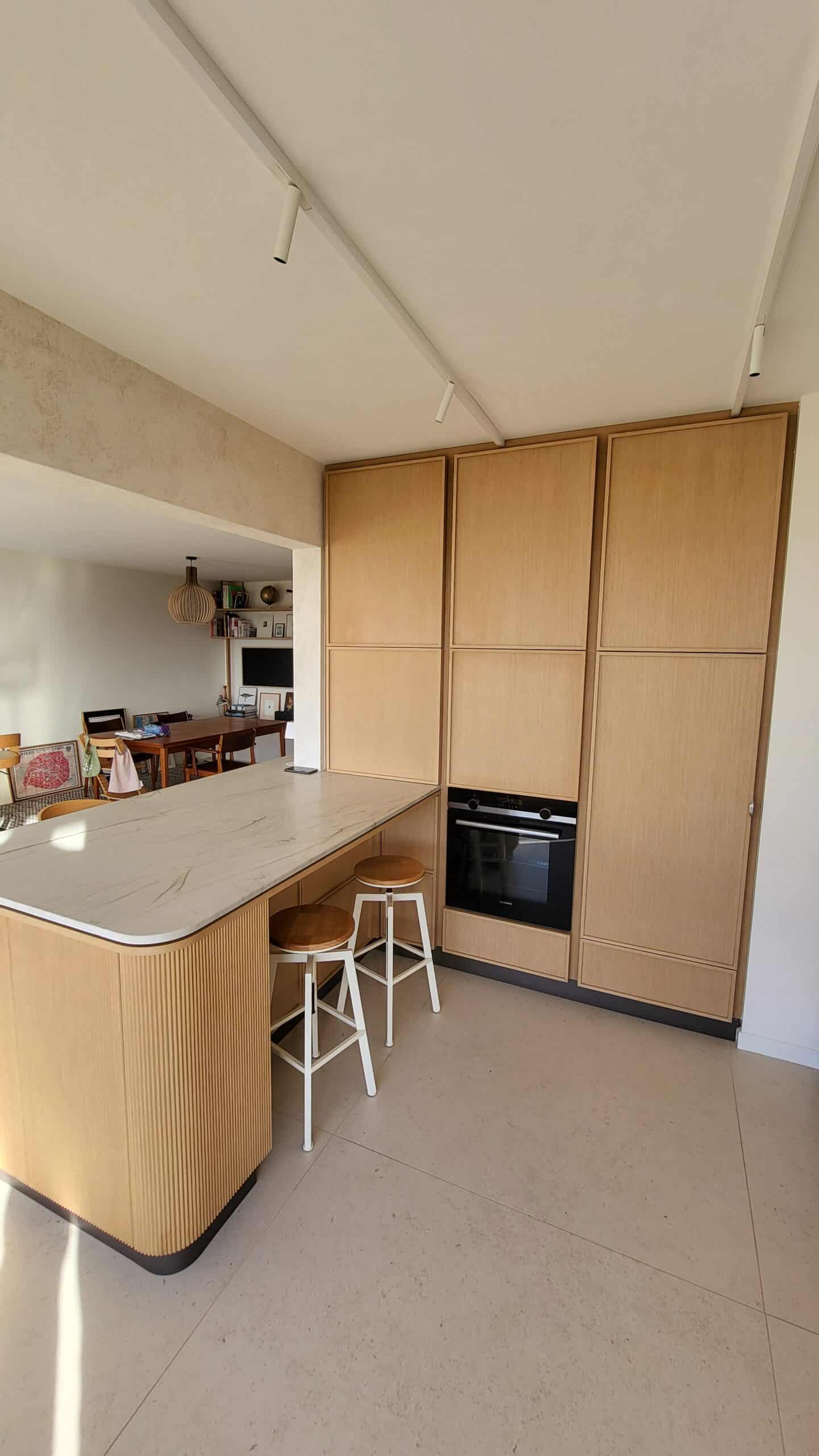 Cuisine sur mesure en bois naturel, aux lignes douces et contemporaines.