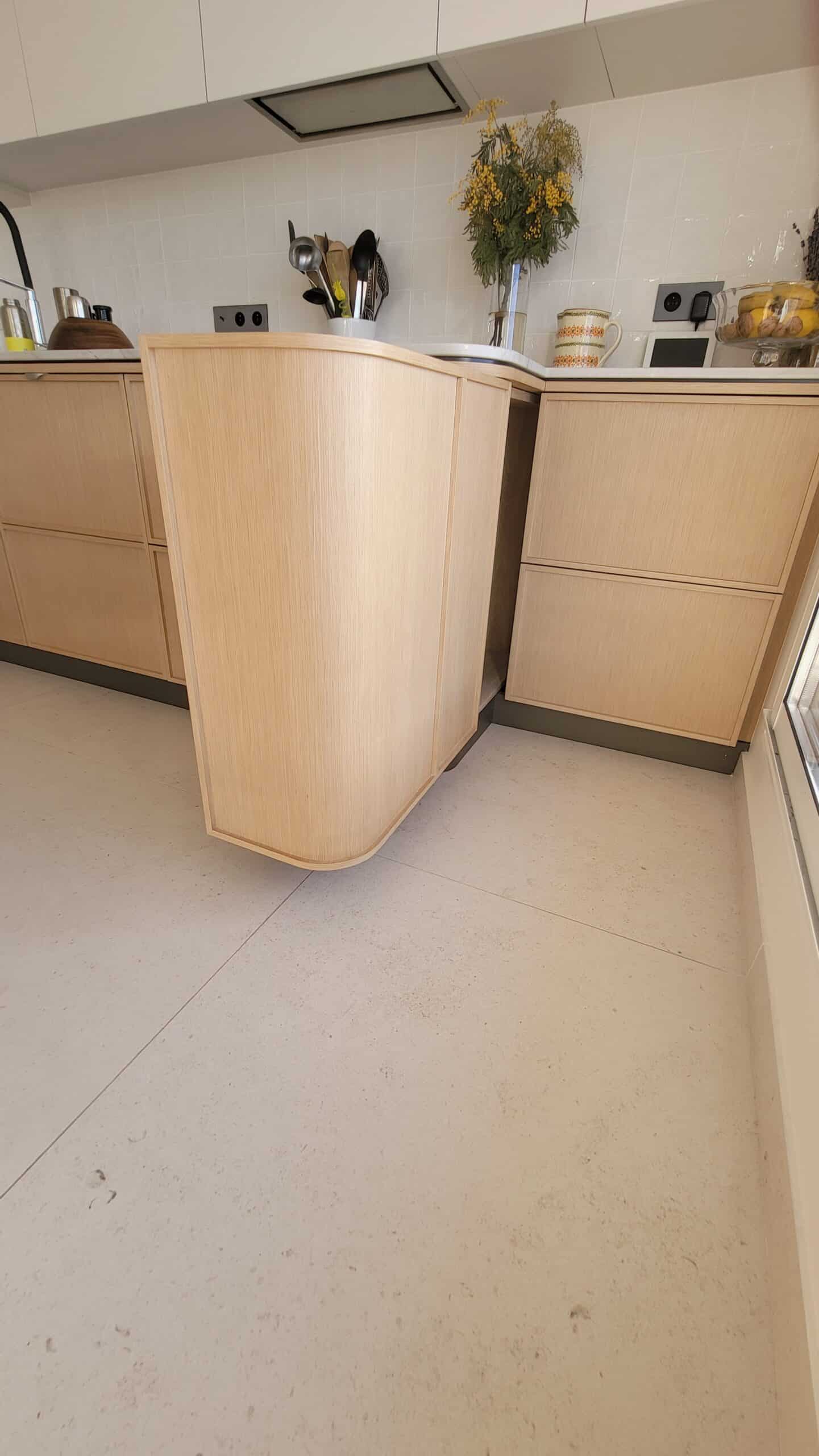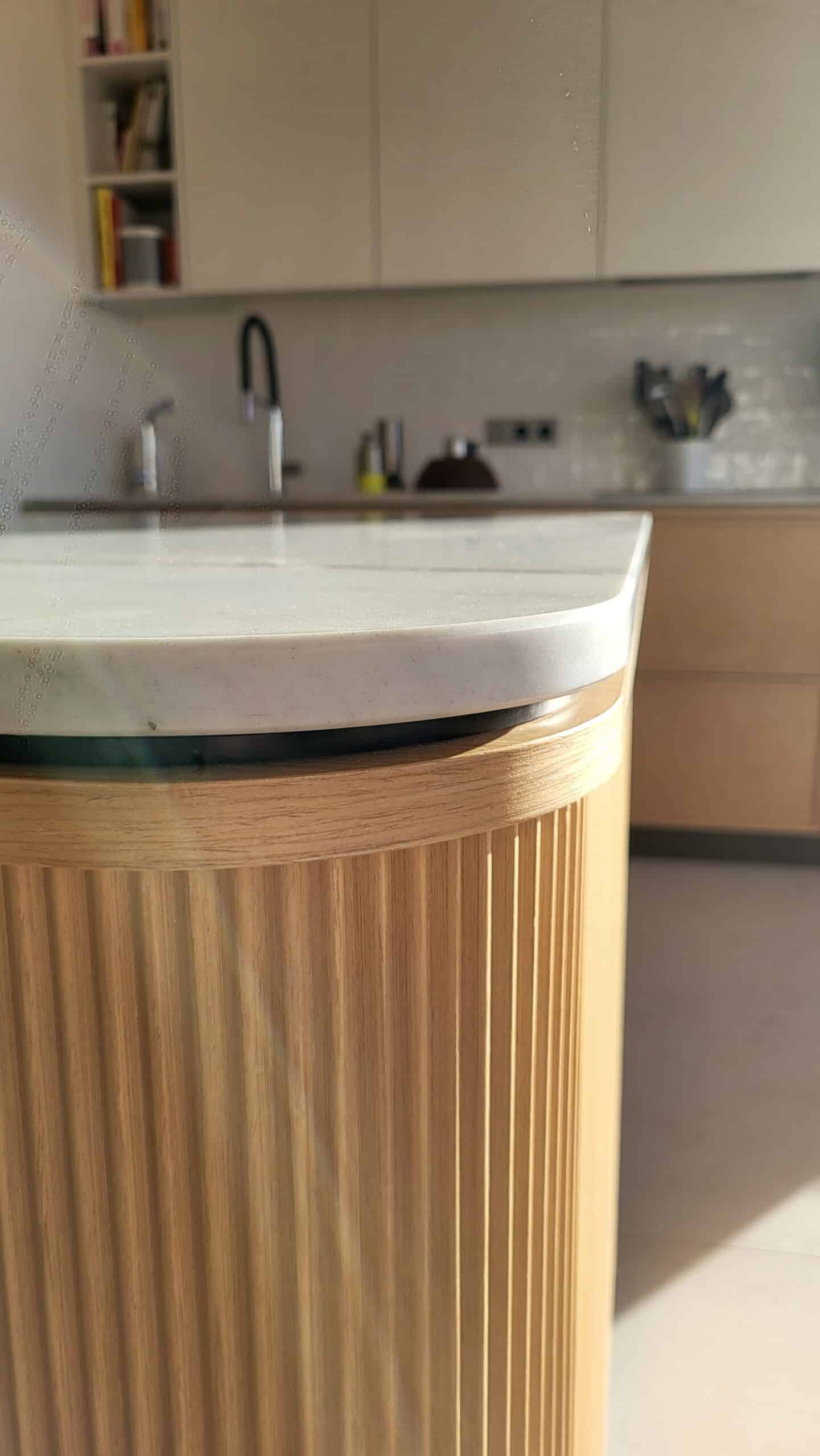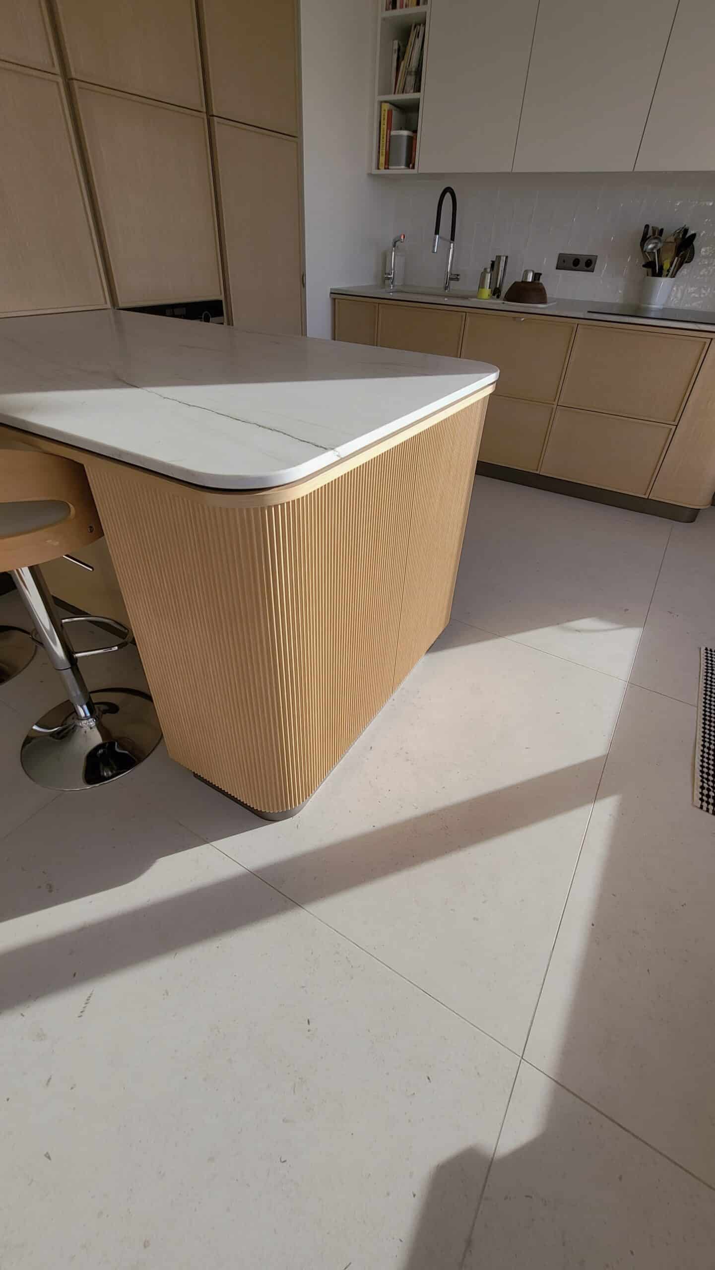 Cuisine sur mesure en bois naturel, aux lignes douces et contemporaines.Un espace pensé pour durer, vivre et partager. ✨Les arrondis adoucissent les volumes, apportent confort et élégance.